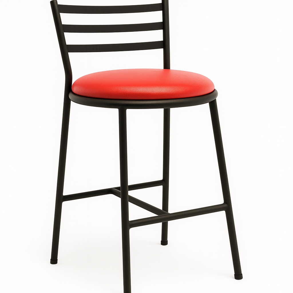 Banqueta metálica con respaldo de lámina doble y asiento tapizado, pensada para barras, comedores o cafeterías de estilo moderno y funcional. Ofrece asiento acolchado y un respaldo metálico de dos niveles que mejora el soporte lumbar. La estructura es de tubo cuadrado de acero con acabado en pintura electrostática; la banqueta es fija y cuenta con aro metálico como descansapiés y regatones plásticos antideslizantes. La estructura está soldada y reforzada para uso continuo en entornos comerciales, garantizando durabilidad y estabilidad.
