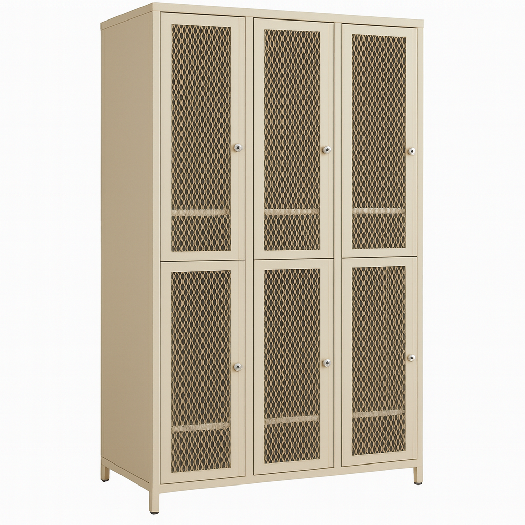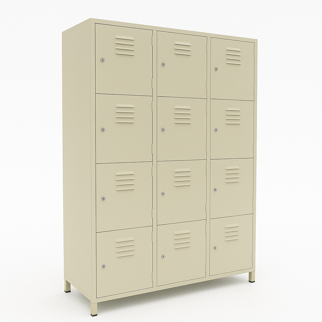 Locker de 12 casilleros individuales con rejillas de ventilación, indicado para vestuarios, escuelas y áreas de personal. Está construido en acero laminado, soldado y acabado con pintura en polvo horneada, lo que le aporta elevada resistencia a rayones, corrosión y uso intensivo. Cada casillero dispone de puerta con cerradura individual, además de tope en las puertas.