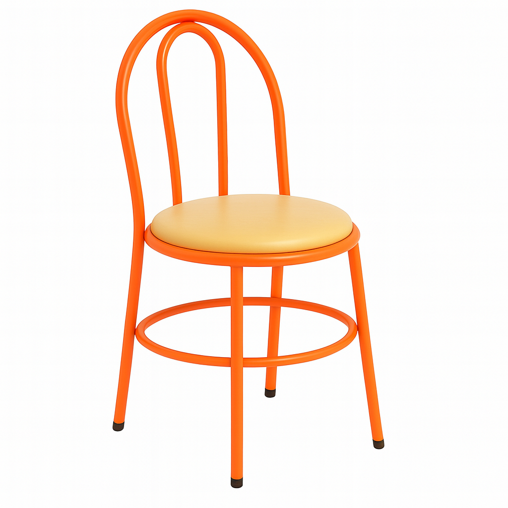Silla metálica de diseño moderno con respaldo compuesto por cinco travesaños horizontales y asiento tapizado, pensada para entornos como restaurantes, comedores y espacios institucionales. Ofrece confort gracias a un asiento acolchado que aporta soporte para uso prolongado. Su estructura es de tubo de acero con pintura electrostática, lo que le confiere resistencia y facilidad de limpieza. Además, es ligera y fácil de trasladar, equipada con regatones protectores antideslizantes y una estructura reforzada diseñada para soportar uso intensivo.