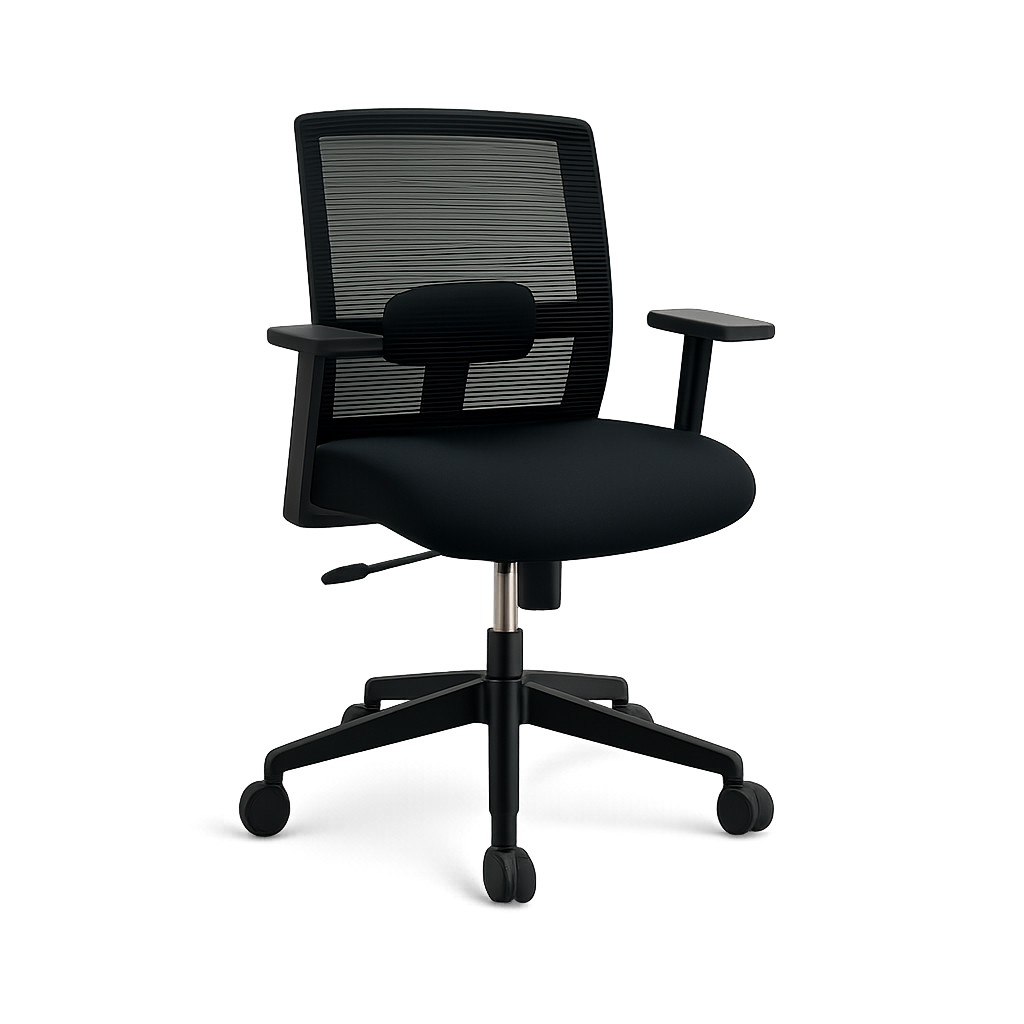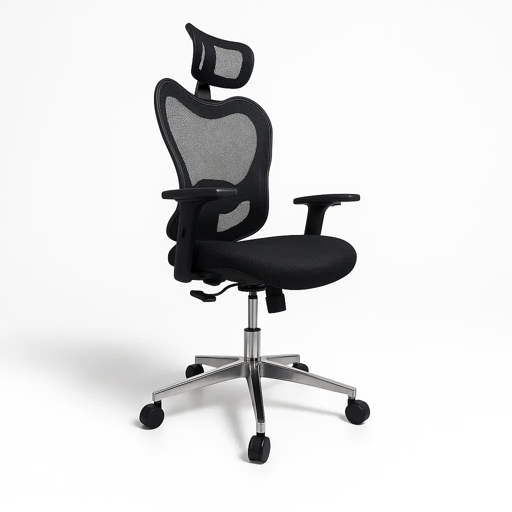Silla ergonómica moderna con respaldo de malla transpirable y asiento acolchado (espuma inyectada de alta densidad). Ofrece soporte lumbar ajustable y ajustes de altura, reclinación y firmeza para jornadas largas de trabajo. Tiene base plástica de cinco apoyos con rodines dobles omnidireccionales y un marco de polipropileno, combinando confort y durabilidad en sus componentes metálicos y plásticos.