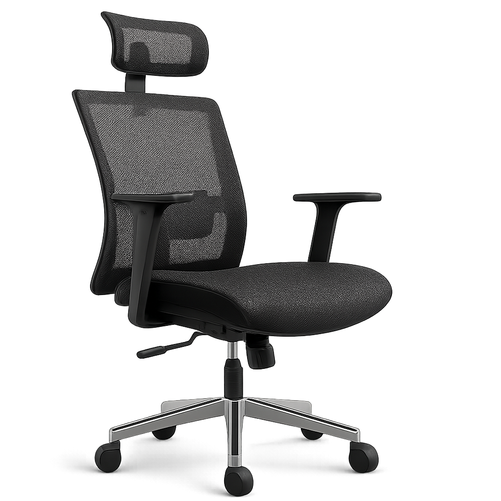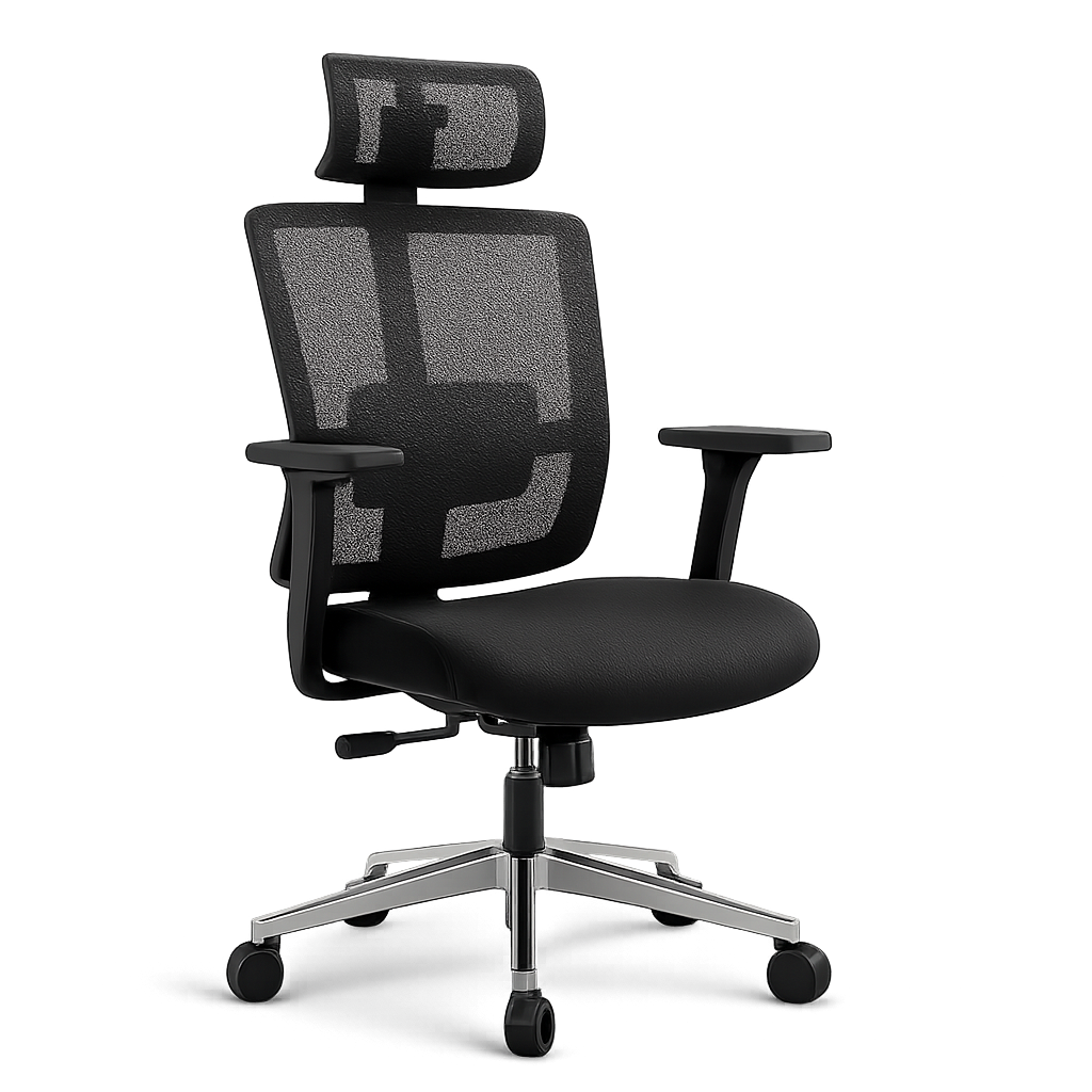 Silla ergonómica con cabecera ajustable, respaldo de malla transpirable y asiento acolchado en espuma inyectada con soporte lumbar fijo. Base metálica de cinco aspas con rodines dobles, pistón clase 3 (certificación BIFMA) y ajustes de altura y reclinación.
