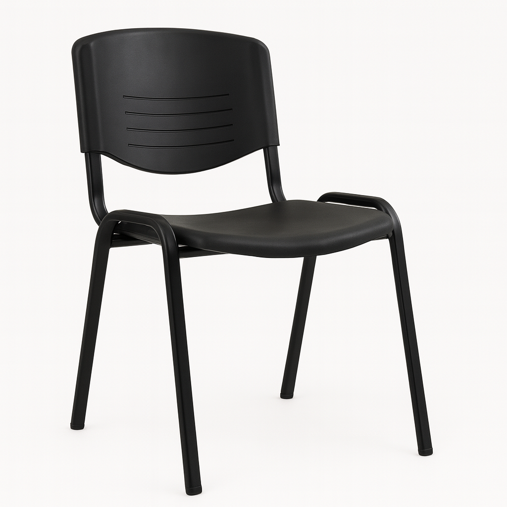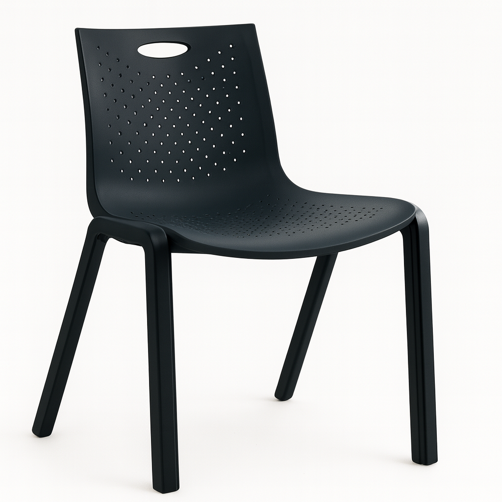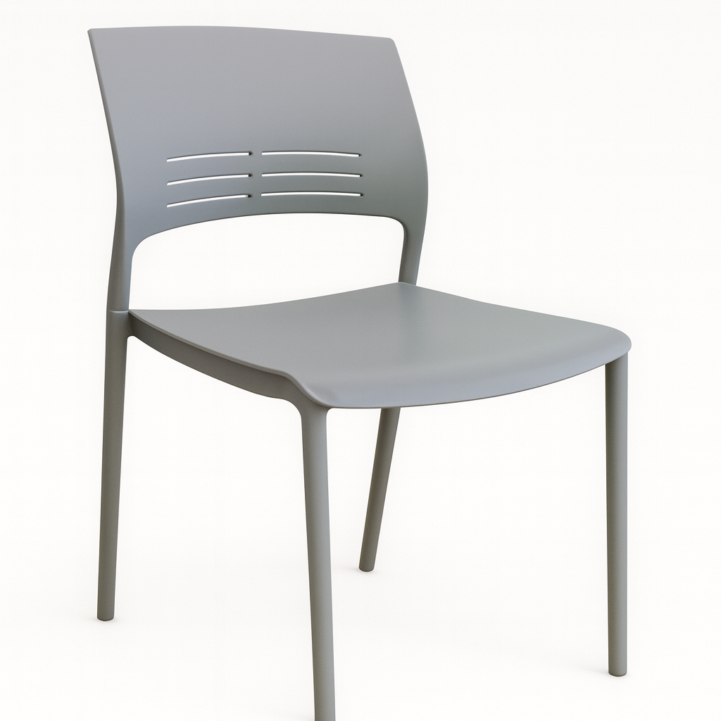 Silla apilable fabricada en polipropileno resistente, diseñada para uso intensivo tanto en interiores como en exteriores. Su cuerpo de una sola pieza en color gris incorpora un asiento ergonómico con perforaciones que facilitan la ventilación y mejoran el confort en sesiones prolongadas.